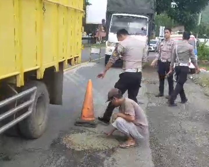 Bahayakan Pengguna Jalan, Polisi Tambal Jalan Berlubang di Pringsewu