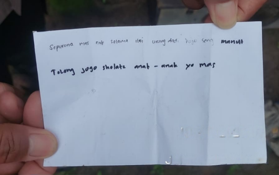 Petugas kepolisian yang menerima laporan langsung mendatangi lokasi dan melakukan olah tempat kejadian perkara (TKP). Dari lokasi, polisi menemukan sebuah amplop berisi tulisan yang diduga pesan terakhir korban, berisi permintaan maaf kepada suami serta pesan agar anak-anaknya dijaga ibadahnya.